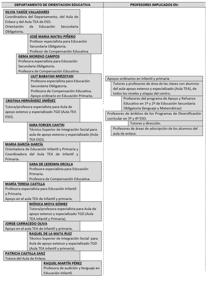 Es un departamento del Centro especializado en apoyar y coordinar las actuaciones encaminadas a asegurar la formación integral y una adaptación de los procesos educativos a las características del alumnado y velar por la atención a la diversidad.